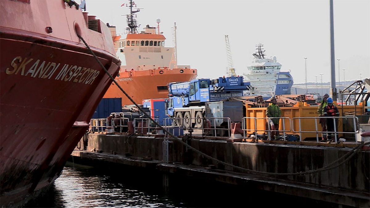 The Skandi Inspector squeezes into the dry dock for its MOT at Aberdeen Harbour.
