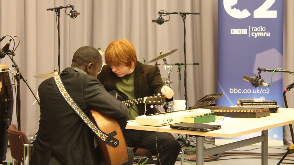 Hanes Debademba a Carwyn Ellis yn recordio sesiwn ar gyfer C2 Y Byd O'r Bae.