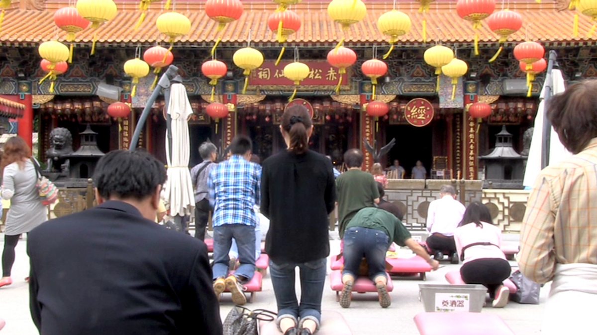 (Photo: Chinese people kneeling and praying for good fortune at a temple in Hong Kong. Credit: Britt Yip)