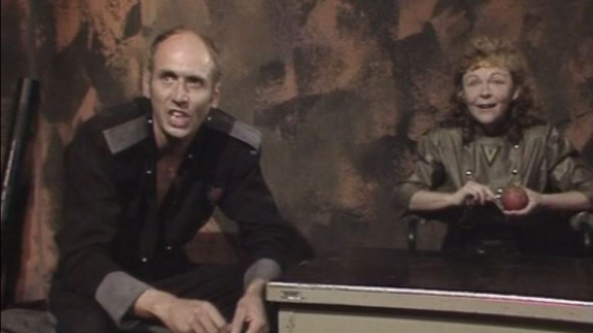 The citizens of Varos watch as the Doctor and his friends elude the pursuing guards.