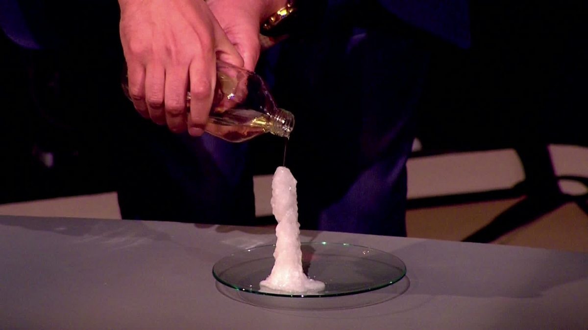 Stephen Fry makes a tower out of sodium acetate and crystals.