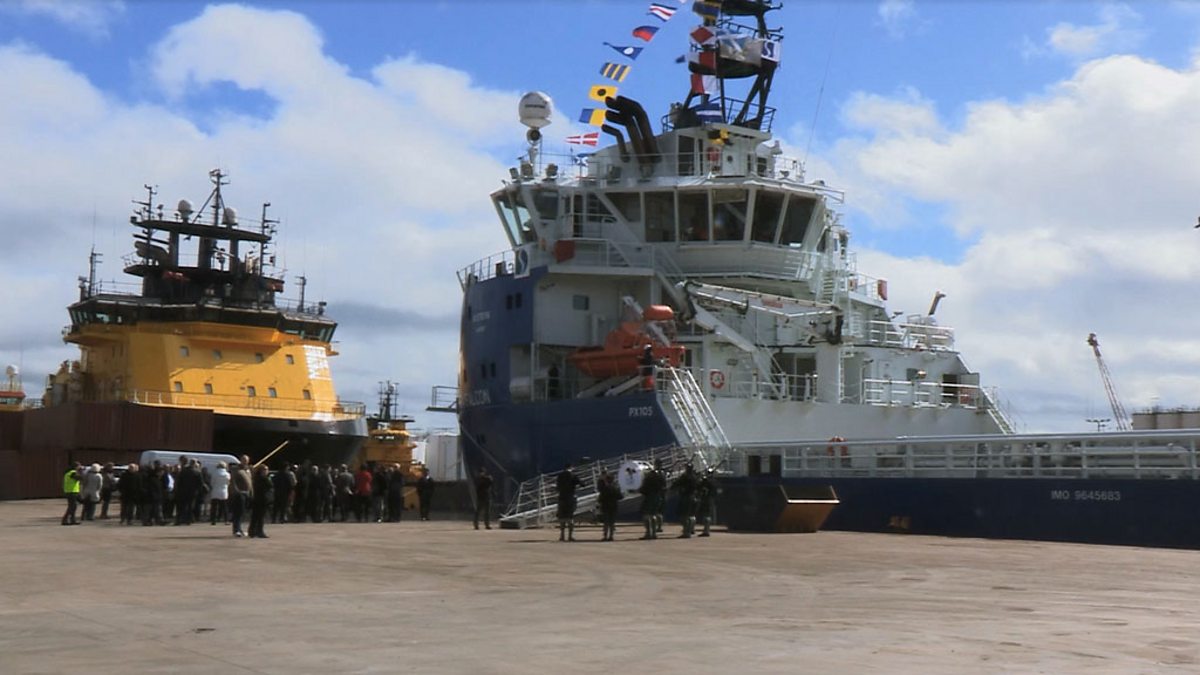 A gale brings hilarity to a ship's christening in Aberdeen Harbour.