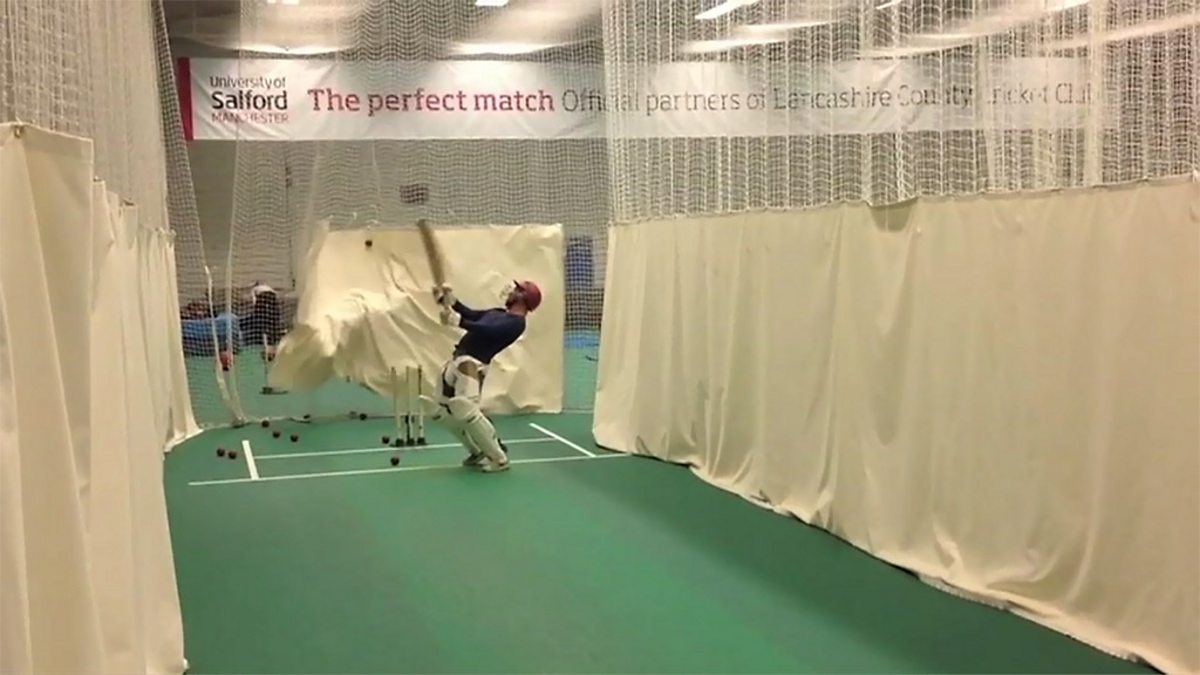 George Riley pads up at the Emirates Old Trafford to experience what it will be like for England's batsmen against Australia. He faces a 90mph delivery and receives advice from cricket coach Tom Jones.