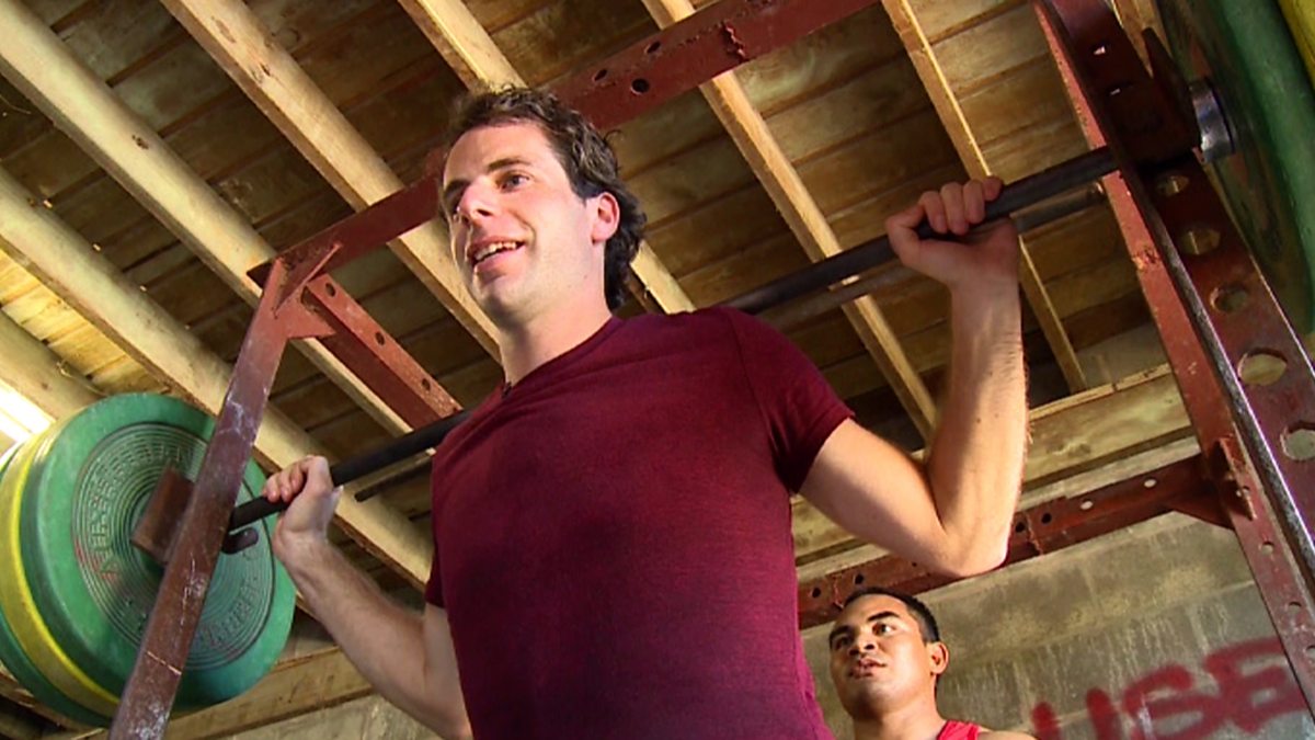 Weightlifting and power lifting is their forte, BBC Queen's Baton Relay presenter Mark Beaumont meets powerlifter Deamo Bagugo for a training session in the island's fire station which doubles up as the gym.