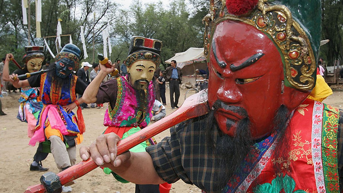 (Image: A group wearing masks of legendary heroes as they perform a dance in Minhe County of Qinghai Province, north-west China. Credit: Getty Images)