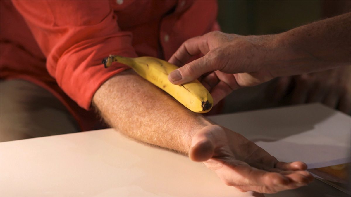 Dr Francis McGlone blindfolds Dr George McGavin and demonstrates just how much sensation we have in our fingertips compared with other parts of the body. A demonstration to show just how much sensation we have in our fingertips.