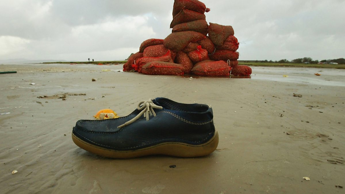 (Photo: A lone shoe and haul of cockles on the beach in Morecambe Bay where the Chinese cockle pickers lost their lives. Credit: Chris Furlong/Getty Images)
