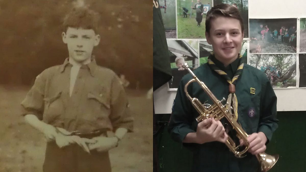 Image shows George Foxlee (left) from the 4th St Albans scout group, who gave the “all clear” on his bugle after Zeppelin raids, and Tom (right) who is a current scout in the group