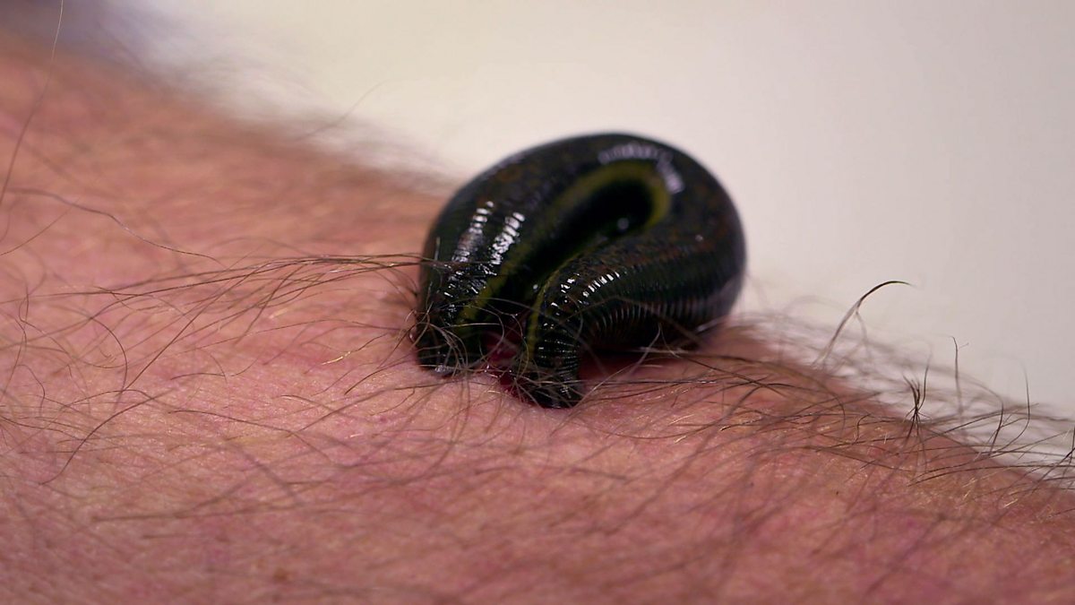 Michael Mosley is bitten by a medical leech under the supervision of Professor Iain Whitaker who uses leeches in surgery.