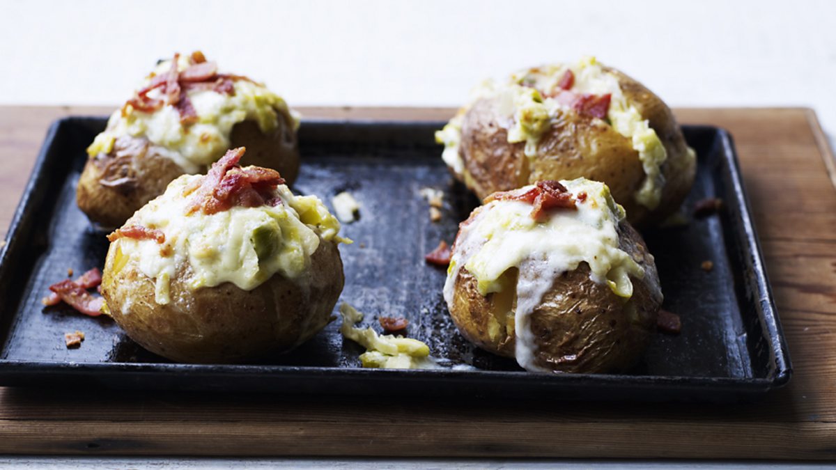 Baked potatoes with bacon, taleggio and leek