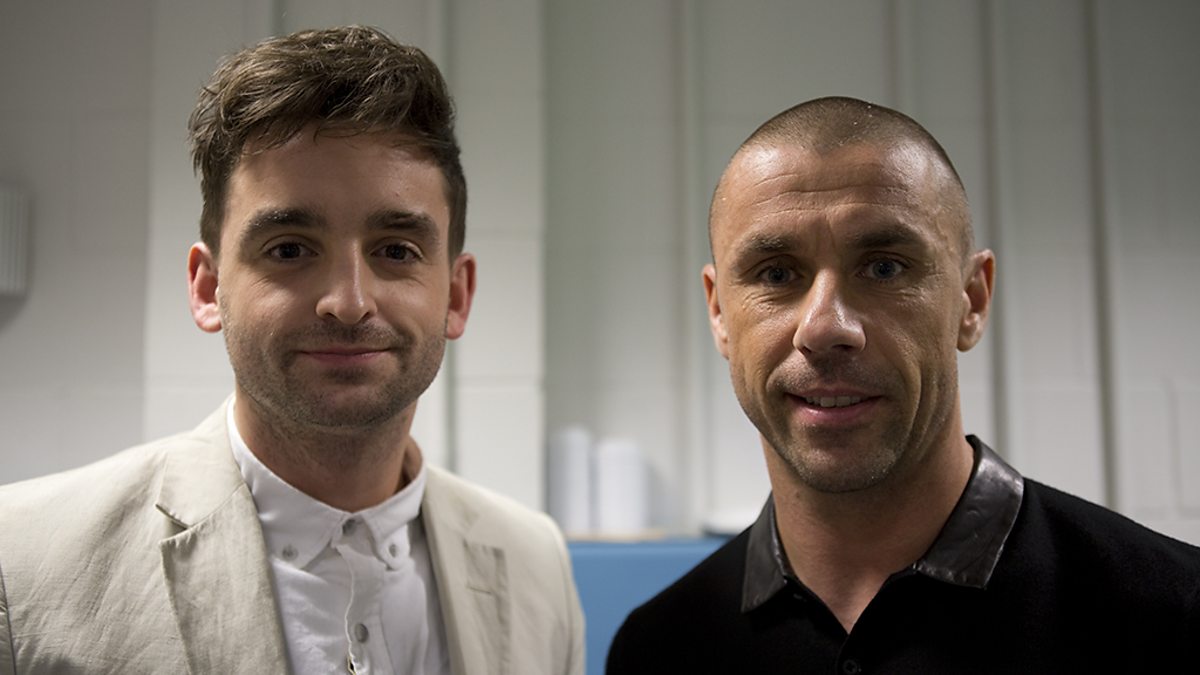 Magician Fergus Flanagan shows off his amazing card tricks to Kevin Phillips backstage.