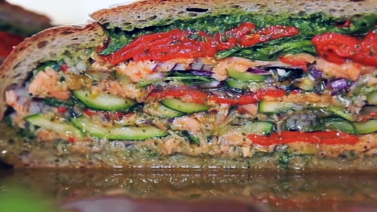 Once prepared this rustic bread stuffed with salmon, peppers, red onions, and watercress pesto will keep for days. Perfect for a large picnic party.