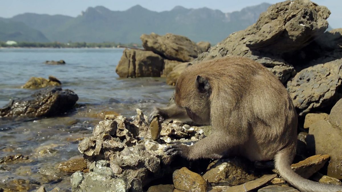 Long tailed macaques in coastal Thailand wait for the tides to go out each day revealing a seafood buffet and then use a whole range of different tools to feast on all the shellfish.