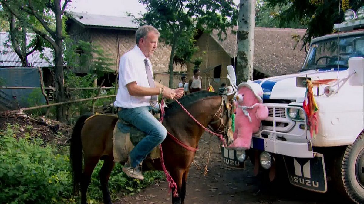 Clarkson, Hammond and May ride horses to the next village to get fuel