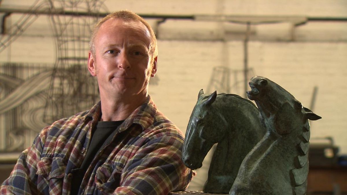An introduction to sculptor Andy Scott and his public art project of 8 years, The Kelpies. Andy views his 30 metre high horses' head sculptures from the air for the first time.