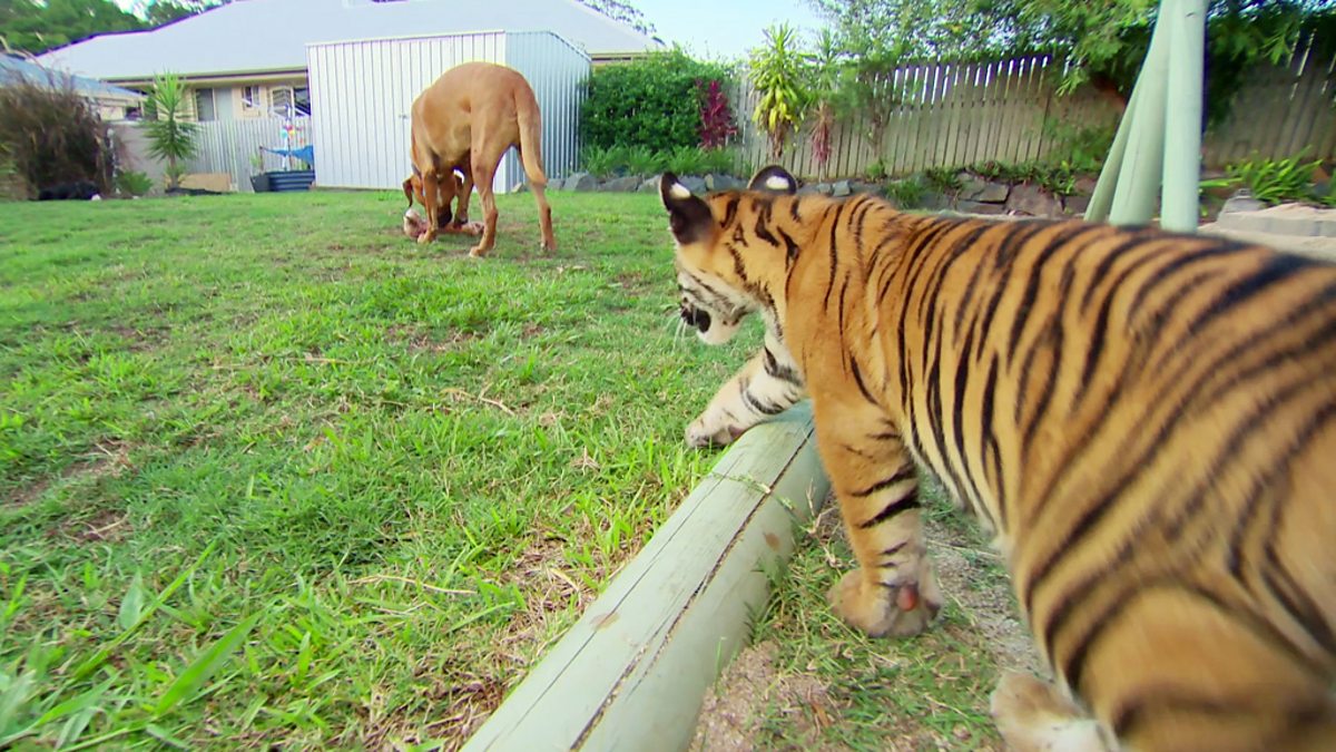 Spot and Stripe's playground is the family garden, and their target practice are easy going family dogs Caesar and Ruby. Giles is on hand to referee.