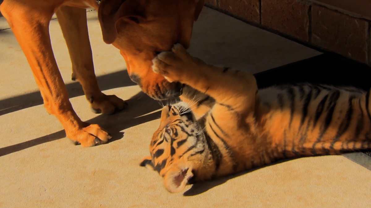 The cubs play-fighting leads them to stalk the family dogs Casar and Ruby - luckily it's all good fun and the easy going dogs give as good as they get.
