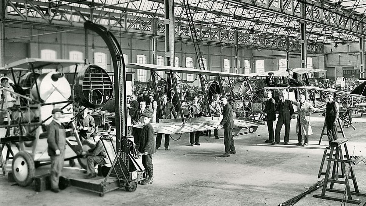 Image shows inside the Filton factory building the Bristol fighter in 1918