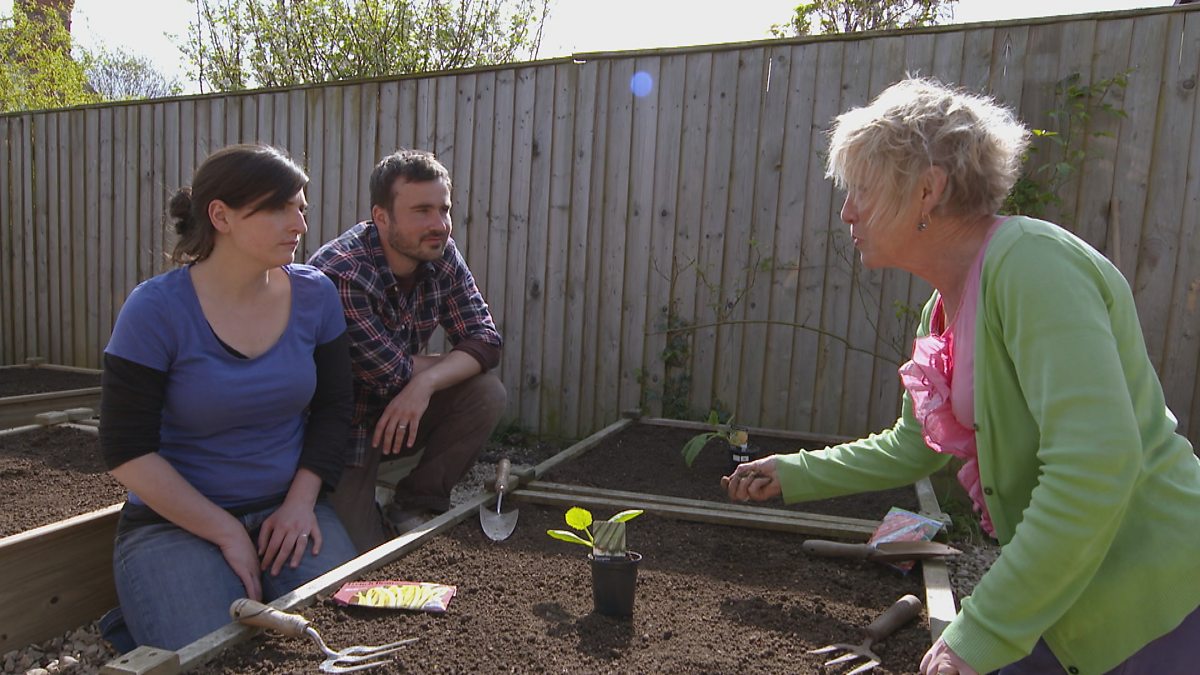 Carol Klein teaches new gardeners Dan and Dominique Farmer how to build and fill raised beds for vegetable growing. They look at soil mixes and plant beans, salads and courgettes for fresh produce all summer.