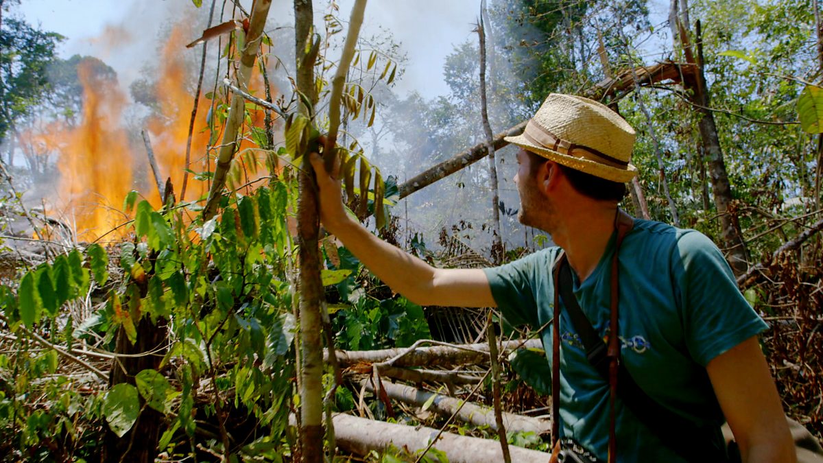 A hesitant Charlie watches cattle rancher Dino and his sons set fire to the rainforest to create more space for grazing.