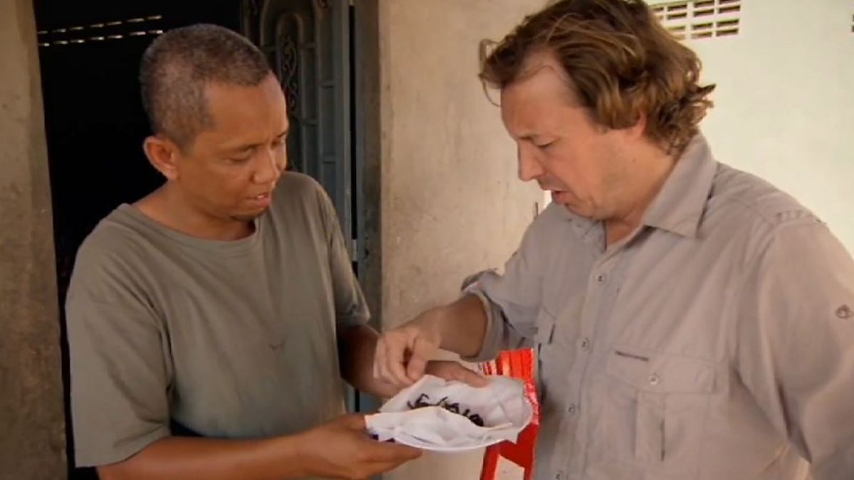 Mason braves eating a deep fried spider - a national favourite in Cambodia.