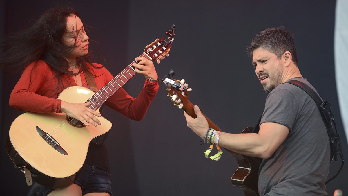Guitar-duelling from the animal rights supporting, vegan, rock/jazz duo. A rare combination