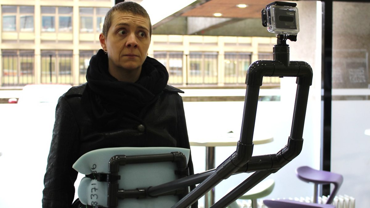 We built what’s known as a SnorriCam, a hands-free camera device that gives the impression that while the presenter is still, the city moves around them. Karen was the first presenter to wear the SnorriCam but we also invited the Glasgow public to have a go, some were more keen than others!