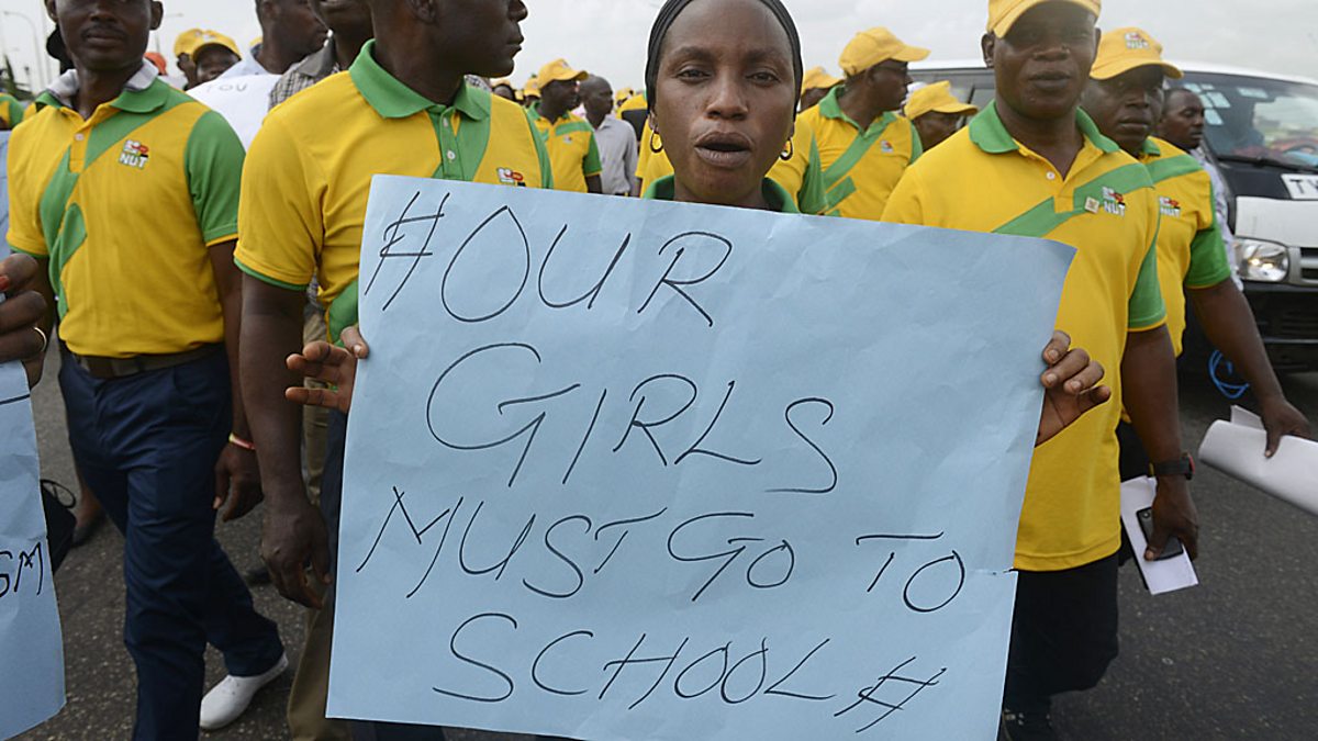 Picture: A Nigerian teacher holds a sign reading 'Our girls must go to school' in a protest rally against the killing of 173 of their colleagues by the Islamist Boko Haram, Credit: AFP/Getty Images