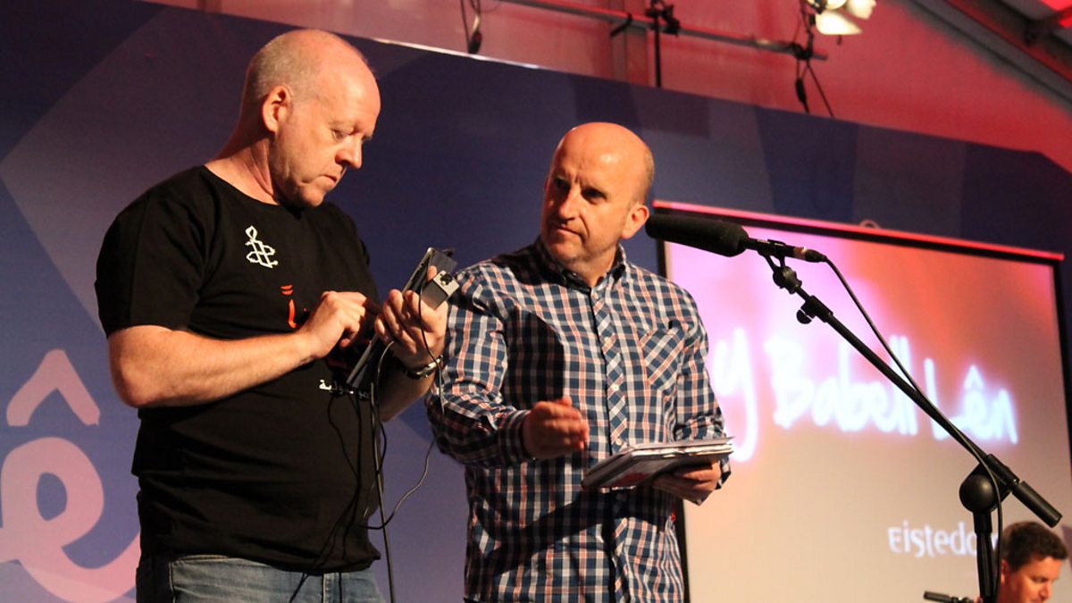 Hywel Gwynfryn a'r tîm yn fyw o Eisteddfod Genedlaethol Sir Gâr.