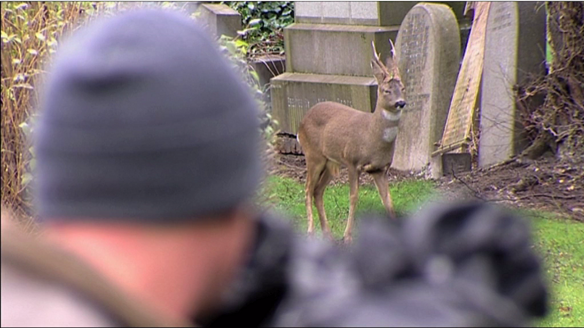 Cemeteries are real oases for wildlife. Every city has them and you expect to find birds nesting, perhaps even foxes. But you don't always think of cemeteries as a place to find deer. The jewel in the crown for this graveyard is the roe deer, certainly not an animal you would think of finding in an inner city cemetery. Normally these animals are quite nervous, and to get close to them you would need to be careful of the wind direction, the noise you made, and keep your distance. But not here. We know that at least two roe deer came to the cemetery originally, but it's difficult to know how they got here in the first place. There is a railway close by and they are traditional highways for wildlife: the rough ground either side of the track is used by lots of creatures. They follow these tracks and suddenly find themselves in the middle of the urban sprawl. There's something very touching about these normally skittish creatures behaving so quietly in the middle of a cemetery.