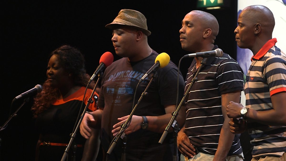 Members of the Namibian choir also known as the Exhibit Quartet perform on BBC Radio Scotland's Culture Studio, ahead of their performance at festival show Exhibit B.