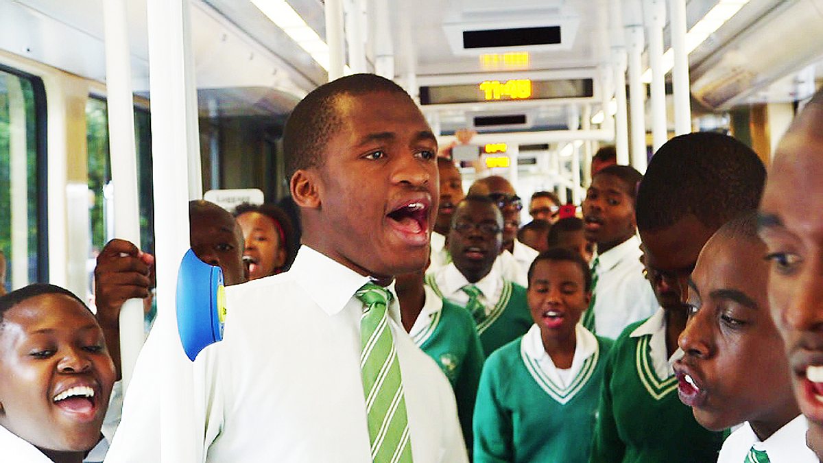 The Dloko High School Choir from Umlazi Township perform on an Edinburgh tram.