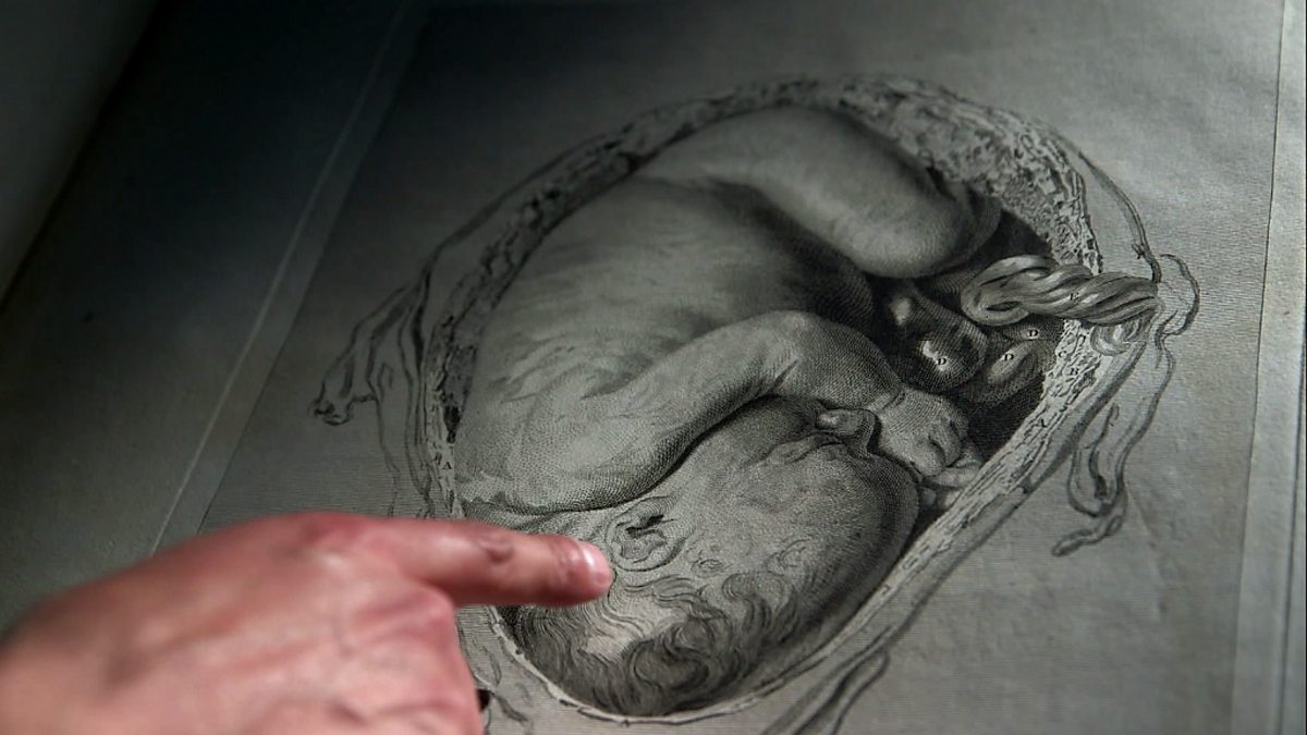 Adam examines an original anatomy guide of the uterus by William Hunter.
