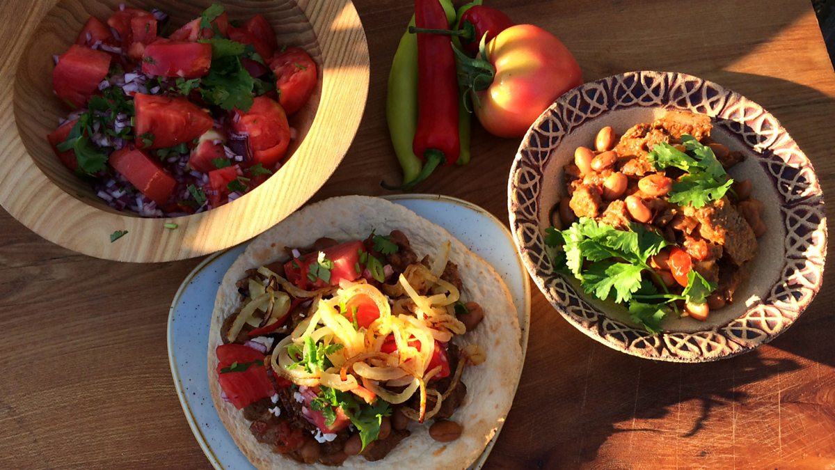Paula McIntyre cooks 'Tostada with Braised Beef, Beans & Caramelized Onions, Tomato Salsa'.