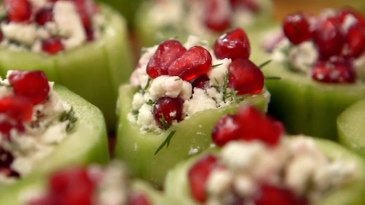 Cucumber and feta bites with dill and pomegranate, and Nice and spicy Thai minced chicken salad (Larb Gai)