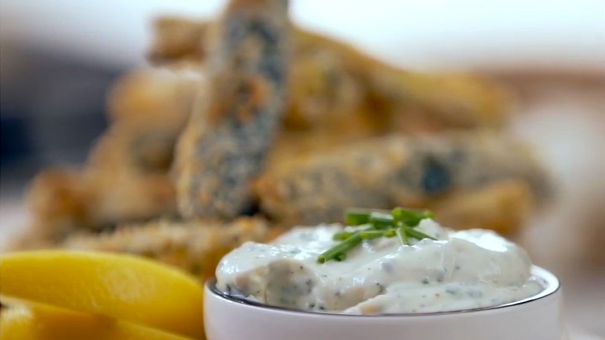 These baked courgette fritters are really rather good and make a change from chips. Kids will enjoy preparing the breadcrumb topping and dripping the fritters into the garlic dip.