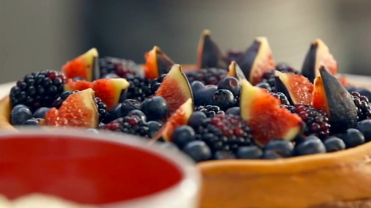 Baked cheesecake with blackberries, blueberries and figs