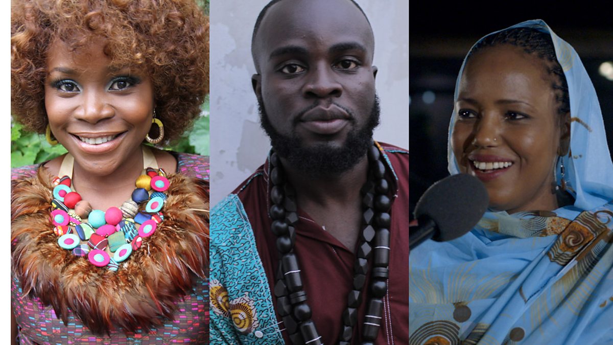 (Photo: From left to right, Nigerian pop diva Omawumi, Ghanaian rapper M.Anisfest and Aziza Brahim from western Sahara. BBC copyright)