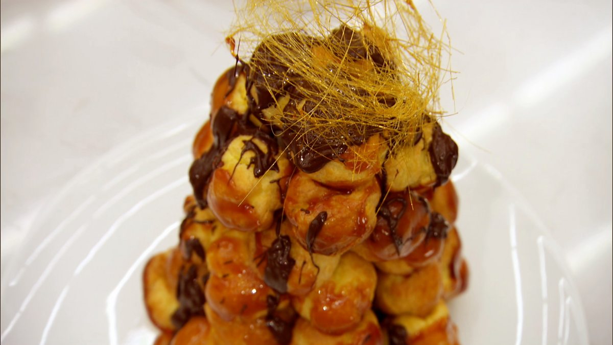 Monica demonstrates how to build a perfect croquembouche, ahead of the first skills test.