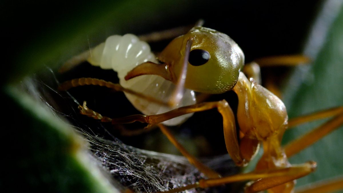 A weaver ant worker uses its own silk-producing grub to glue together leaves to form a protective nest for the colony.