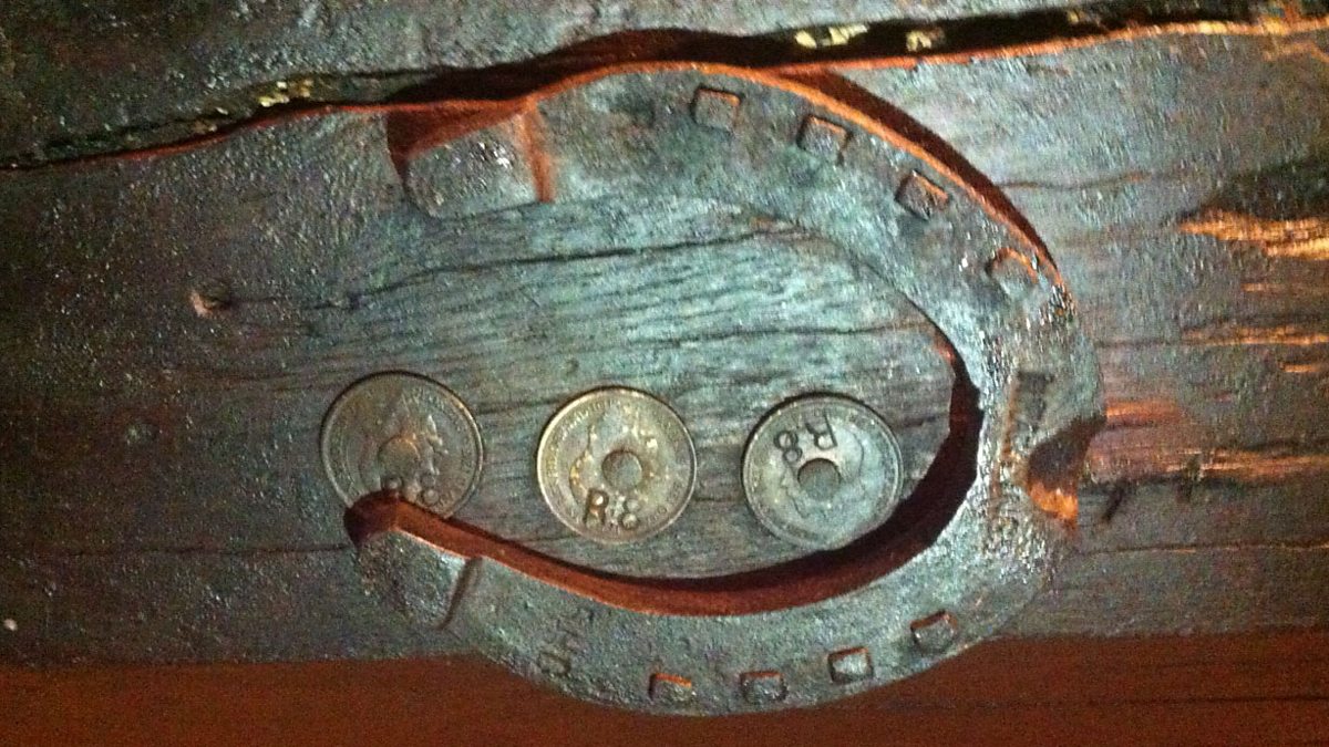 If you look up as you sit in front of the fireplace in The Crown in Hartest, near Bury St Edmunds, you’ll see a series of 26 coins nailed on to the beams.