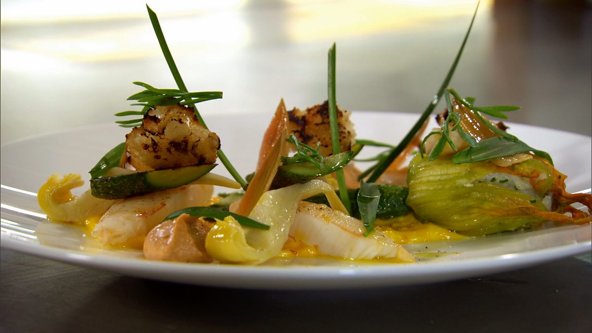 Marcus demonstrates his Cornish crab dish complete with artichokes and roasted courgette.