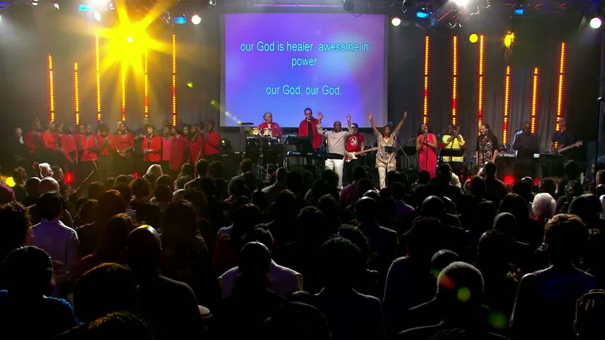 Choir and congregation at Birmingham Christian Centre perform hymn, Our God Is Greater.