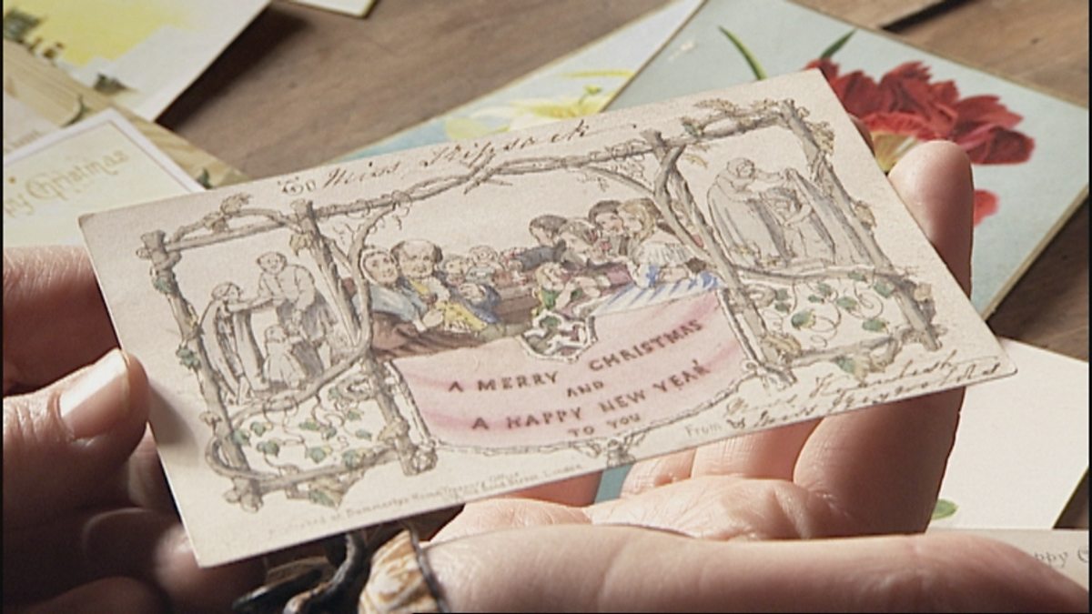 Collector Jackie Brown shows historian Ruth Goodman the first ever Christmas card, which was commissioned in 1843 by Sir Henry Cole, in this 2009 clip from Victorian Farm Christmas.