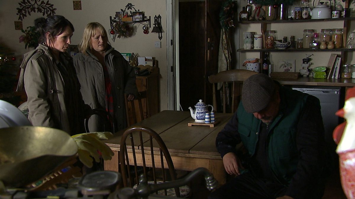 Cyhudda Eileen Jim o fod yn hen fabi mawr am wrthod lladd y tyrcwn ‘Dolig. Beth fydd ymateb Colin a Dai pan glywant fod Gabriela yn ferch i Meic? Eileen accuses Jim of being a big baby for refusing to kill the Christmas turkeys. How will Colin and Dai react to the fact that Gabriela is Meic’s long lost daughter?