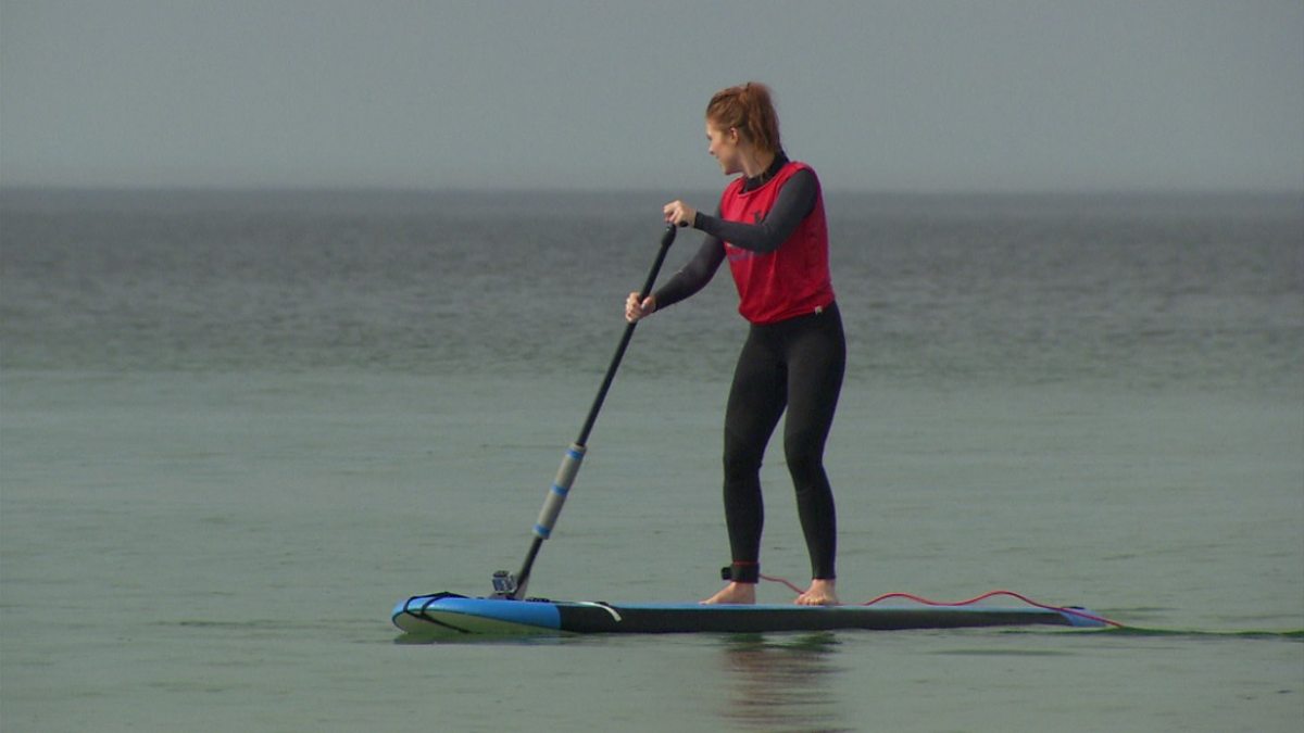 Angela gets some tips on paddle-boarding along the North Coast of Northern Ireland - but how long can she stay upright?