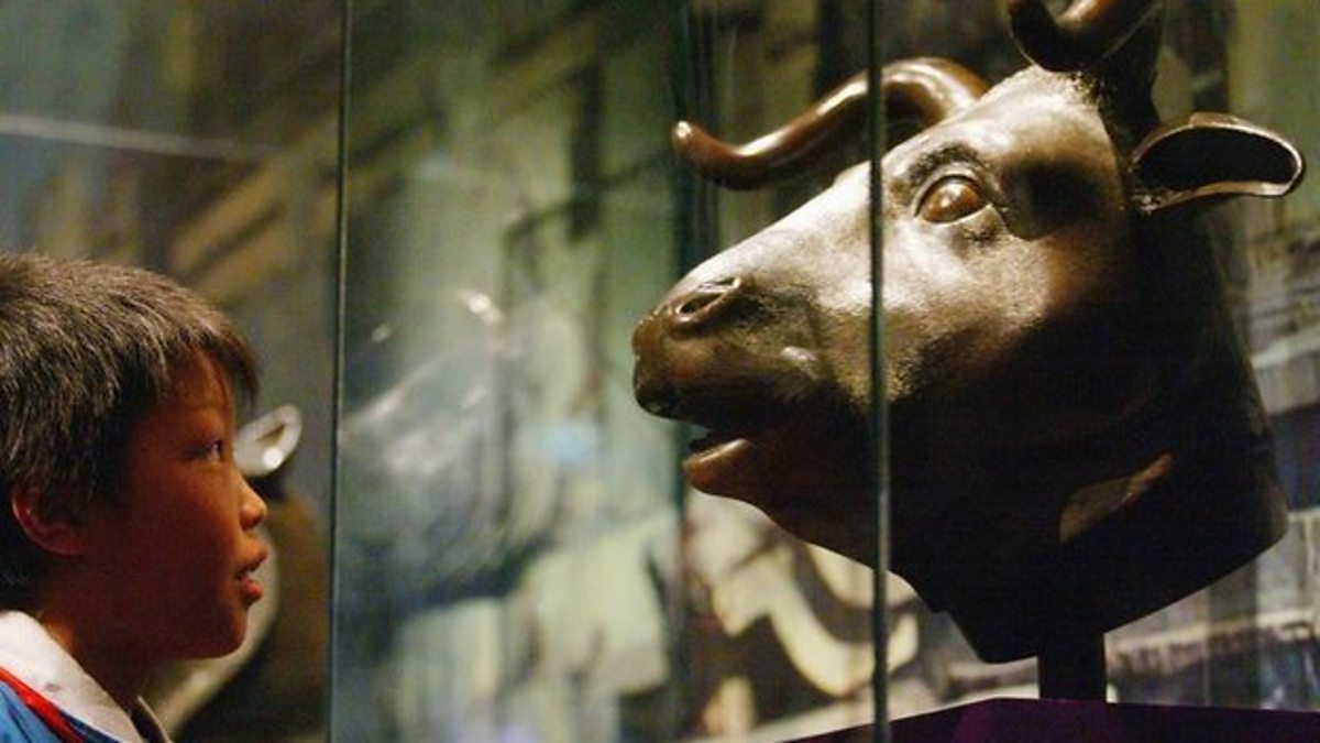 (Photo: A boy views a Qing Dynasty (1644-1911) bronze ox head at a special exhibition April 28, 2005 in Shenyang of Liaoning Province, China. Credit: Getty Images)