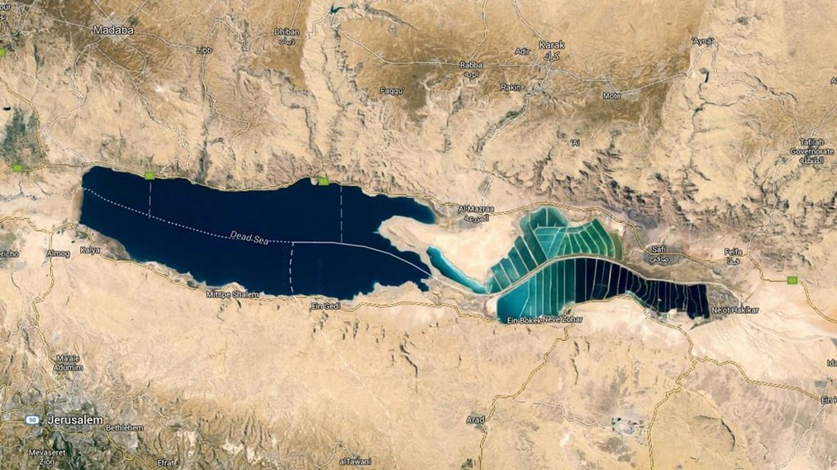 (Picture: Dead Sea, showing southern evaporation ponds to right; Credit: Google)