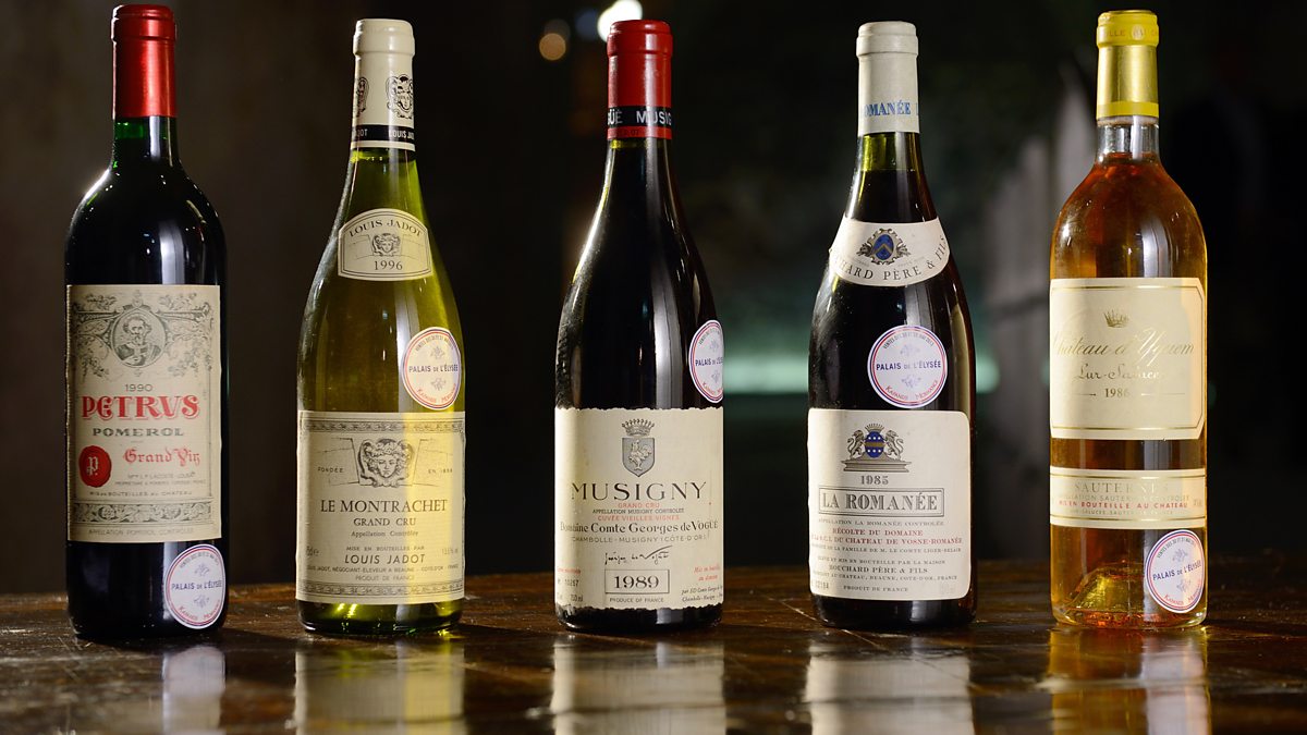 (Photo: From left, a bottle 1990 Bordeaux's Chateau Petrus, a 1996 Le Montrachet Grand Cru, a 1989 Musigny Grand Cru, a 1985 La Romanee and a bottle of 1986 Chateau d'Yquem of 1986. Credit: Feferberg/AFP/Getty Images)