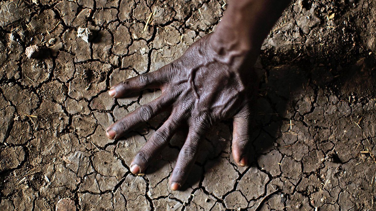 (Image: A man places his hand on the parched soil. Credit: Press Association)